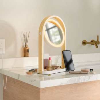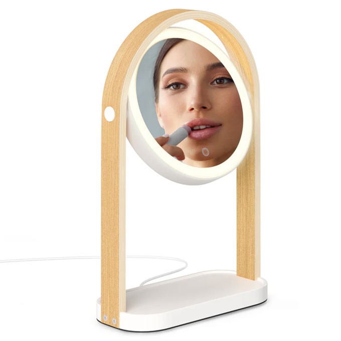 | • The double-sided mirror pivots to feature a 10x magnifier on the opposite side • Effortlessly cycle through three light temperatures - Warm White (2700K), Natural White (4000K), and Cool White (6500K) - with a simple touch sensor on the mirror surface. Hold the touch sensor for dimmability • No batteries required. Just plug in via USB and enjoy consistent, reliable light |